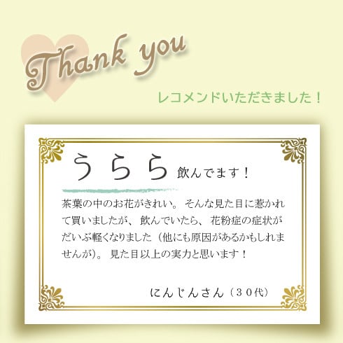 まるでスキップしたくなるような軽い飲み口に爽やかな香り、お湯を注ぐとポットやティーバッグの中で咲く花に季節を感じて。